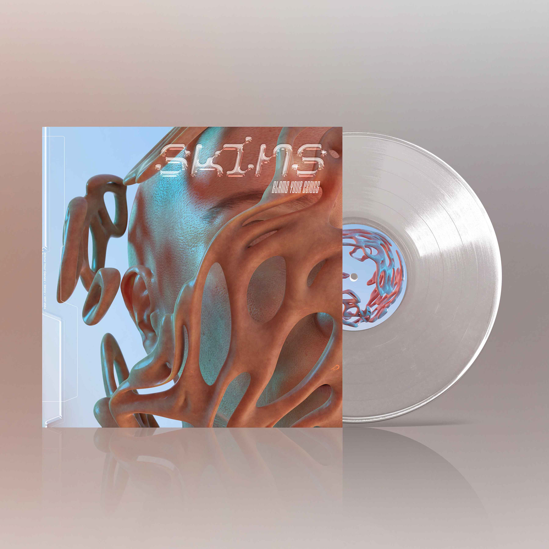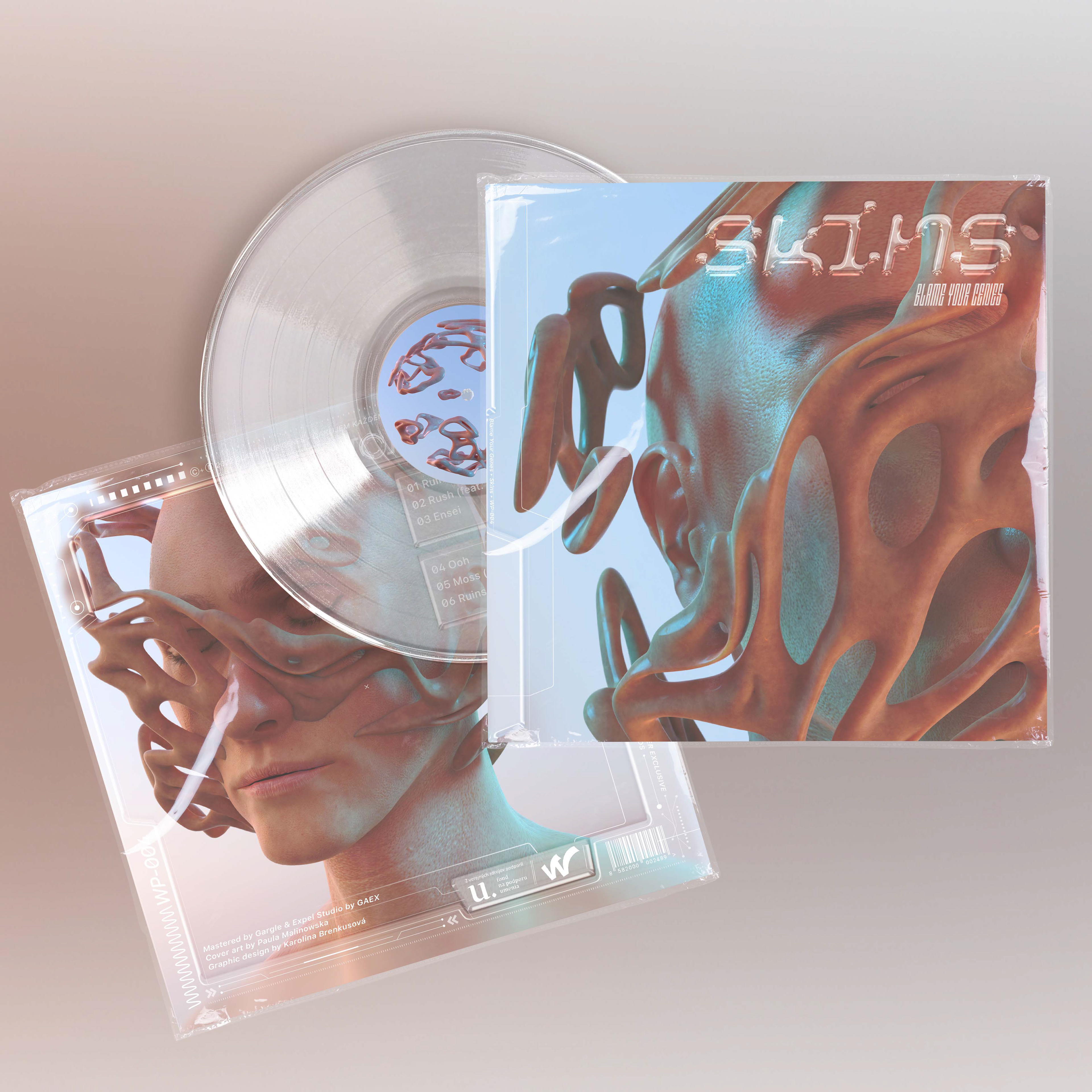 Cover art for Blame Your Genes EP "SKINS". 2022. in collaboration with Krolína Brenkusová (graphic design, mockups)